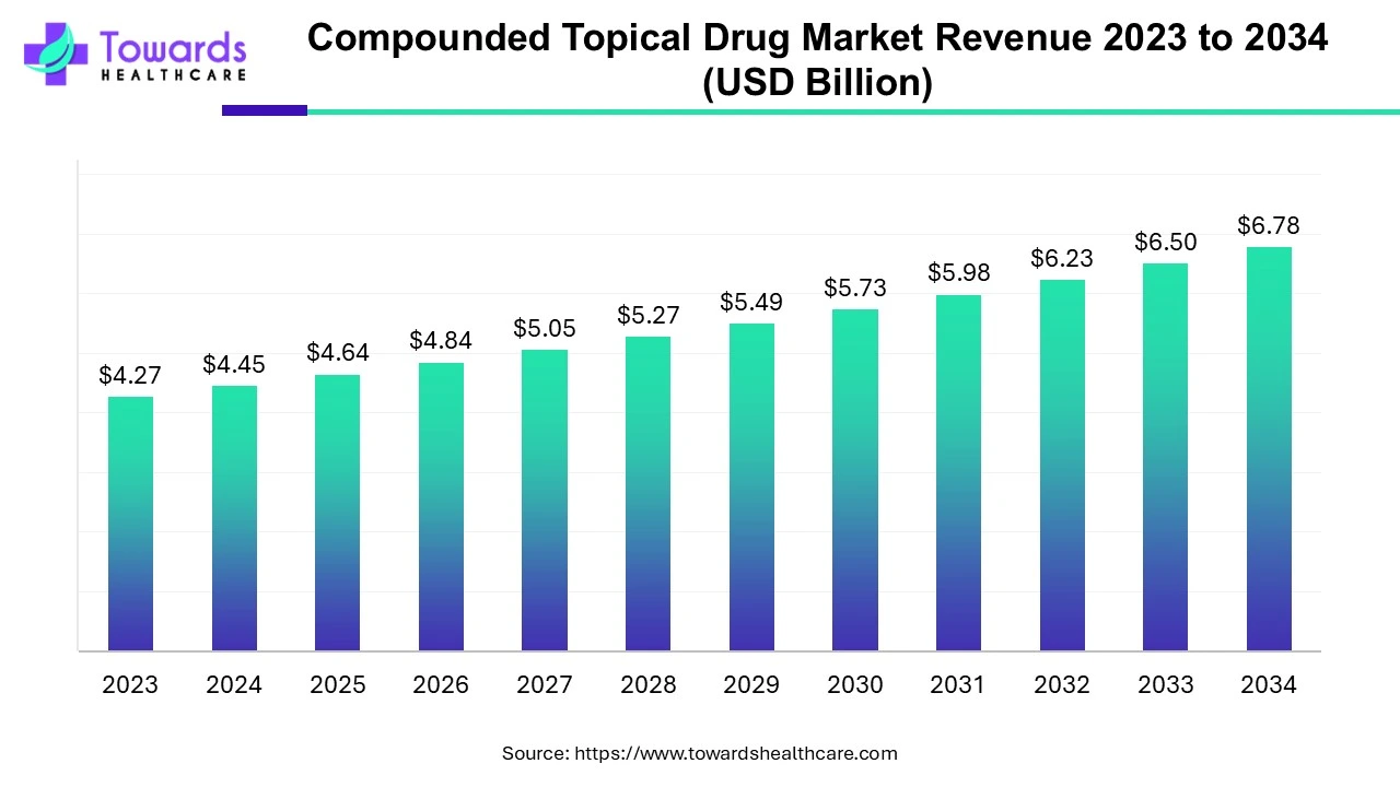 Ottawa, April 16, 2025 (GLOBE NEWSWIRE) — According to Towards Healthcare research, the global compounded topical drug market size was valued at USD 4.45 billion in 2024 and is predicted to hit around USD 6.78 billion by 2034, a study published by Towards Healthcare a sister firm of Precedence Research.