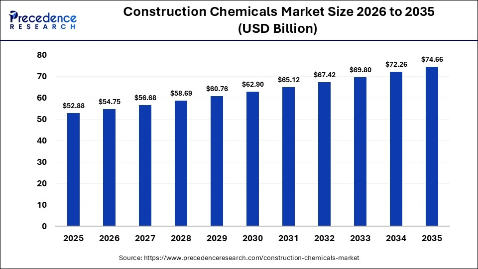 According to Precedence Research, the global construction chemicals market size is estimated to reach nearly USD 74.66 billion by 2035, increasing from USD 54.75 billion in 2026, growing at a strong CAGR of 3.51% from 2026 to 2035.