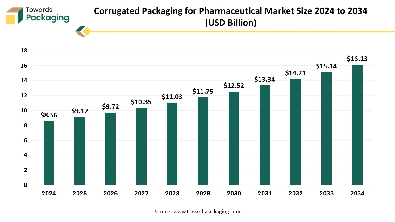 As detailed in the latest report by Towards Packaging, the global corrugated packaging for pharmaceutical market is forecast to grow from USD 9.72 billion in 2026 to about USD 16.13 billion by 2034, at a CAGR of 6.54% between 2025 and 2034.