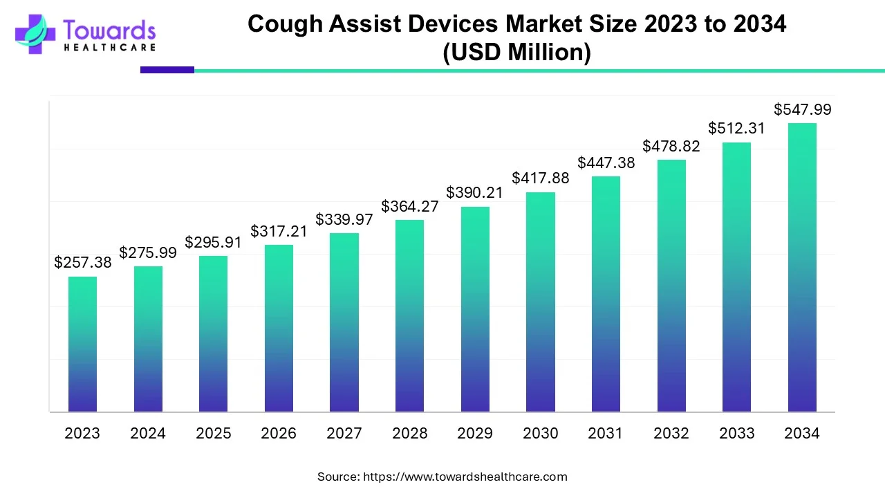 The global cough assist devices market size is calculated at USD 295.91 million in 2025 and is expected to reach around USD 547.99 million by 2034, growing at a CAGR of 7.24% for the forecasted period.