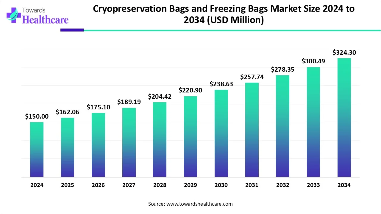 The global cryopreservation bags and freezing bags market size was valued at USD 162.06 million in 2025 and is predicted to hit around USD 324.3 million by 2034, rising at an 8.04% CAGR, a study published by Towards Healthcare a sister firm of Precedence Research.