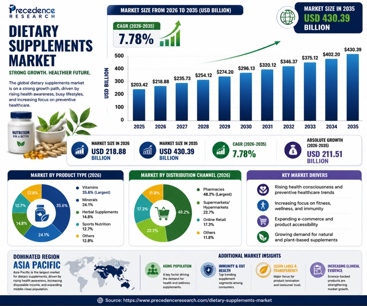 According to Precedence Research, the global dietary supplements market size is estimated to reach nearly USD 430.39 billion by 2035, increasing from USD 218.88 billion in 2026, growing at a strong CAGR of 7.78% from 2026 to 2035.