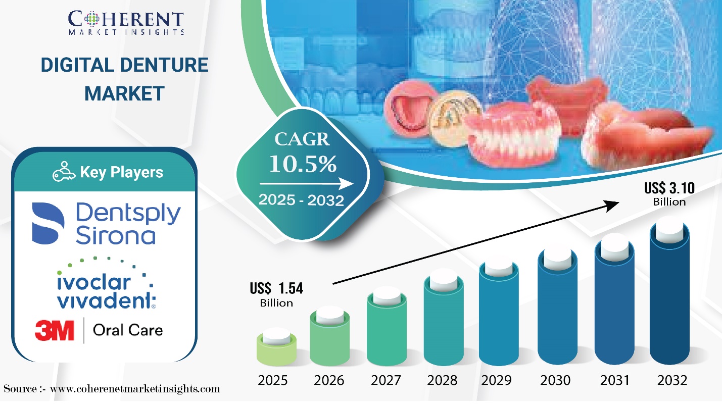Digital Denture Market Size to Reach $3.10 Billion, Globally, by 2032 at 10.5% CAGR, says Coherent Market Insights