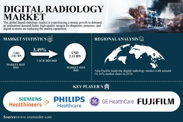 According to SNS Insider, the global Digital Radiology Market was valued at USD 1.61 billion in 2024 and is projected to reach USD 2.11 billion by 2032, growing at a CAGR of 3.49% during 2025–2032. The U.S. market led the global landscape with a valuation of USD 0.30 billion in 2024, expected to achieve USD 0.40 billion by 2032, supported by technological advancements, regulatory approvals, and widespread adoption of AI-powered imaging solutions across hospitals, clinics, and outpatient centers.