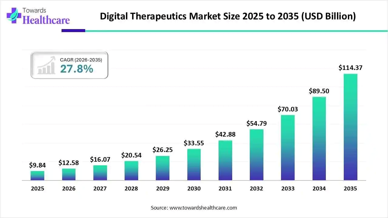 The global digital therapeutics market size was valued at USD 9.84 billion in 2025 and is predicted to hit around USD 114.37 billion by 2035, rising at a 27.8% CAGR, a study published by Towards Healthcare Research & Consulting, a sister firm of Precedence Research.