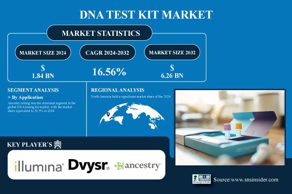 According to SNS Insider, the global DNA Test Kit Market was valued at USD 1.84 billion in 2024 and is projected to expand at a CAGR of 16.56% during 2025-2032 to reach USD 6.26 billion by 2032. The US led the market with USD 0.67 billion in 2024 and is expected to reach USD 2.09 billion by 2032, driven by strong consumer demand for genetic information, widespread acceptance of direct-to-consumer (DTC) testing, and the growing role of personalized medicine in preventive health.