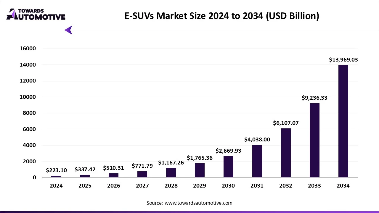 According to Towards Automotive research, the global E-SUVs market size is calculated at USD 337.42 billion in 2025 and is expected to reach around USD 13,969.03 billion by 2034, growing at a CAGR of 51.24% from 2024 to 2034.