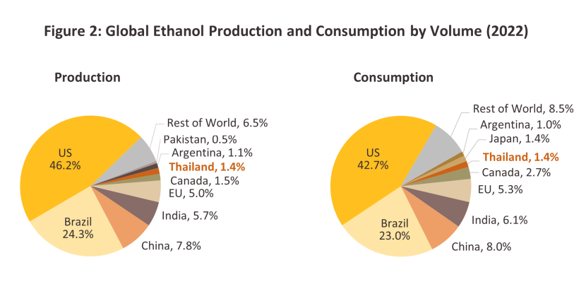 Thailand ranks 7th globally in both ethanol production and consumption, with most of its output used in transportation fuels such as E10, E20, and E85 gasohol. The main raw materials used in Thailand are molasses, cassava, and sugarcane, with molasses being the most common due to its steady availability and strong integration with the domestic sugar industry.