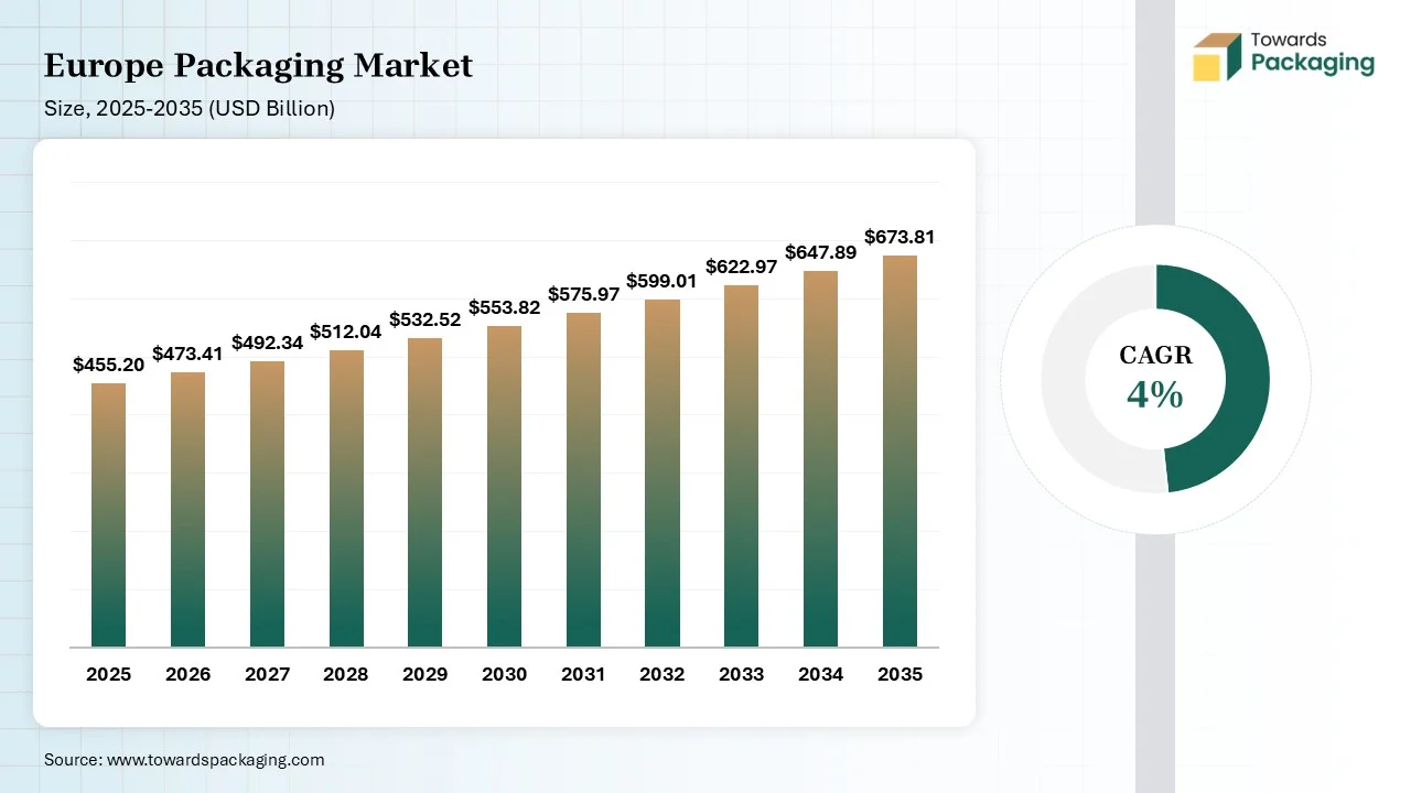According to Towards Packaging consultants, the global Europe packaging market is projected to reach approximately USD 673.81 billion by 2035, increasing from USD 473.41 billion in 2026, at a CAGR of 4% during the forecast period 2026 to 2035.