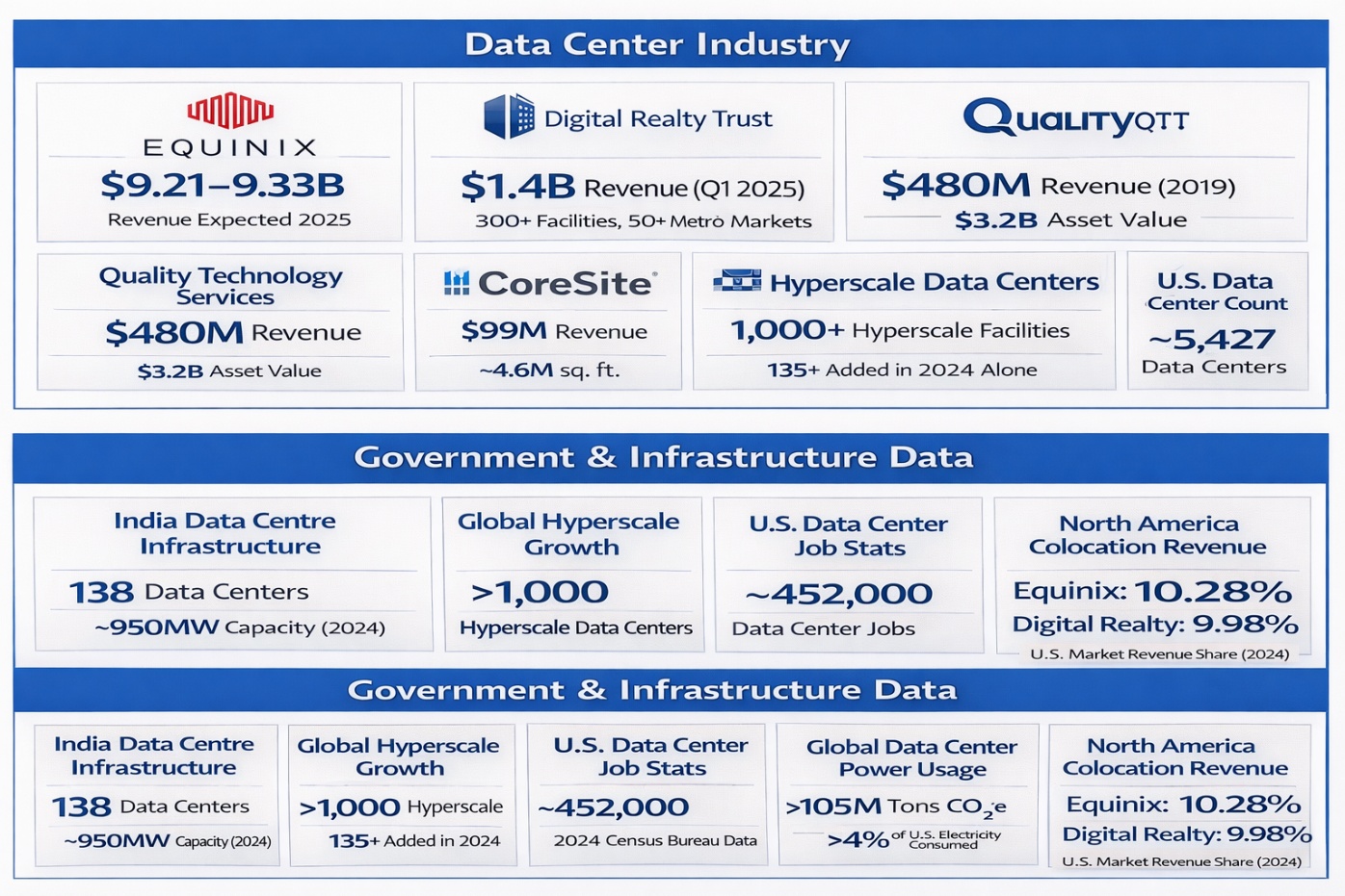 | Global Data Center Power Usage | U.S. centers consumed >4% of national electricity; ~105 million tons CO₂e in 2023 | Highlights the environmental impact of running data centers. |