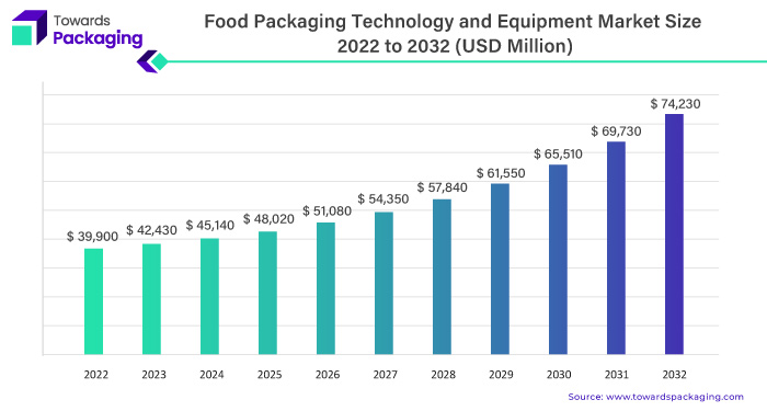 The global food packaging technology and equipment market size surpassed USD 42,430 million in 2023 and is estimated to reach around USD 74,230 million by 2032, a study published by Towards Packaging a sister firm of Precedence Research.