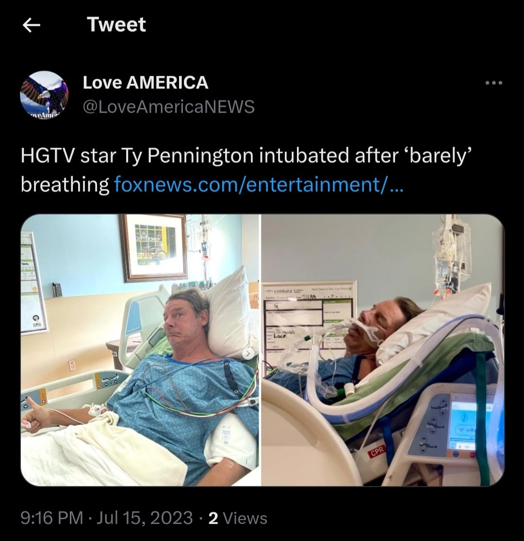 Ty Pennington tweeted, “From the red carpet, to the ICU… this last week has been interesting,” next to a photo of himself in the hospital and another of him at the Los Angeles premiere of “Barbie.”