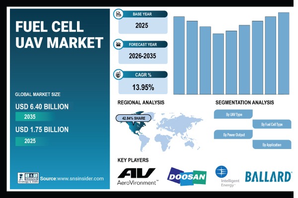 Austin, United States, April 17, 2026 (GLOBE NEWSWIRE) — According to SNS Insider, The Fuel Cell UAV Market size is valued at USD 1.75 Billion in 2025 and is projected to reach around USD 6.40 Billion by 2035, growing at a CAGR of 13.95% during 2026–2035. The market is expected to grow between 2026 and 2035 due to a number of factors, including the need for UAVs with longer endurance times, an expansion in their use in military and surveillance operations, a focus on sustainable power supply and zero emissions, and investments in fuel cells and hydrogen.