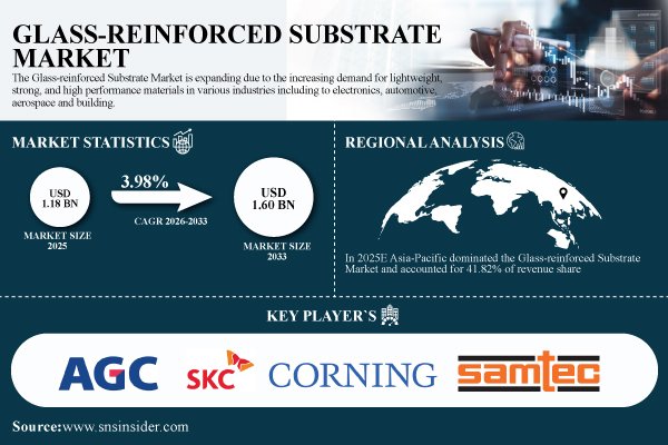 According to the SNS Insider,“The Glass-reinforced Substrate Market size was valued at USD 1.18 Billion in 2025E and is projected to reach USD 1.60 Billion by 2033, growing at a CAGR of 3.98% during 2026-2033.”