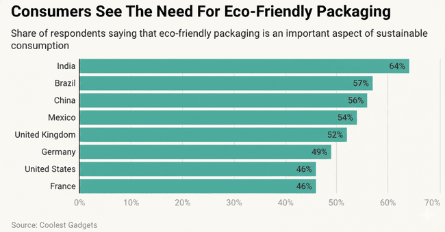 Globally, 54% of shoppers now prefer packaging that is recyclable, compostable, or reusable, while 51% favor products that use less plastic. Around 31% also prefer paper-based packaging, illustrating a widespread shift toward renewable and biodegradable materials.