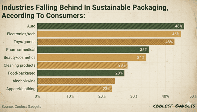 Among industries, the food and packaged goods sector leads in sustainable packaging adoption, followed by the clothing industry (35%) and the beauty sector (30%). However, other sectors lag behind 46% of shoppers believe the automotive industry is falling short on green packaging initiatives.