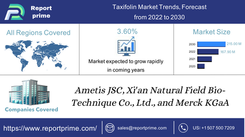 Taxifolin, a flavonoid compound found in various plants, has garnered attention for its antioxidant properties and potential health benefits. Market reports on Taxifolin delve into its industry dynamics and applications. Main findings highlight its increasing use in pharmaceuticals, nutraceuticals, and cosmetics due to its antioxidant and anti-inflammatory properties. Recommendations often revolve around expanding research to explore its therapeutic potential and diversifying applications.The Taxifolin Market is expected to grow from USD 167.90 Million in 2022 to USD 215.00 Million by 2030, at a CAGR of 3.60% during the forecast period.