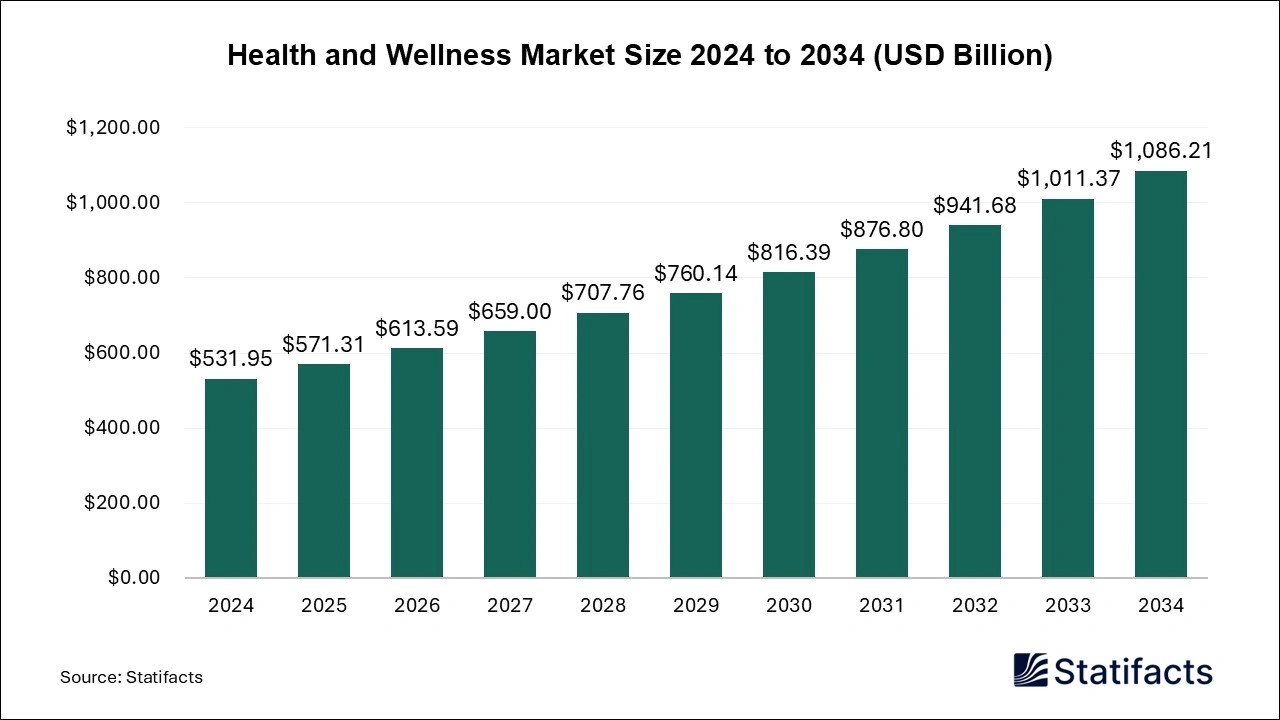 According to Statifacts, the global health and wellness market size stood at USD 531.95 billion in 2024 and is anticipated to exceed USD 1,086.21 billion by 2034, expanding at a CAGR of 7.4% from 2025 to 2034.