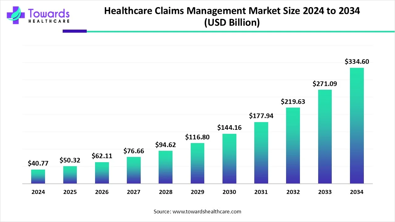 Ottawa, Nov. 14, 2025 (GLOBE NEWSWIRE) — The global healthcare claims management market size was valued at USD 40.77 billion in 2024 and is predicted to hit around USD 334.6 billion by 2034, rising at a 23.43% CAGR, a study published by Towards Healthcare a sister firm of Precedence Research.