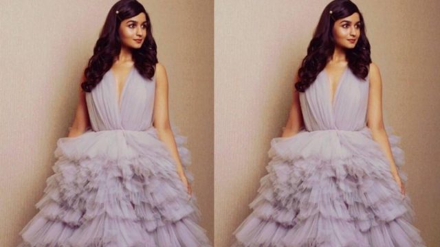 Alia Bhatt looked like she walked straight out of a fairytale as she rocked a voluminous lavender ruffled gown with a plunging detailed neckline as her was hair styled with loose curls.