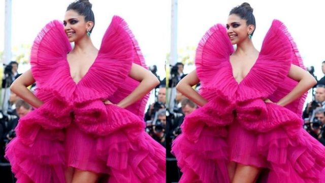 Deepika Padukone definitely had eyes gawking as she made a striking appearance in this pink high-low hem gown featuring layers of dramatic ruffles. She added a neat high slick bun with a smokey eye and black heels.