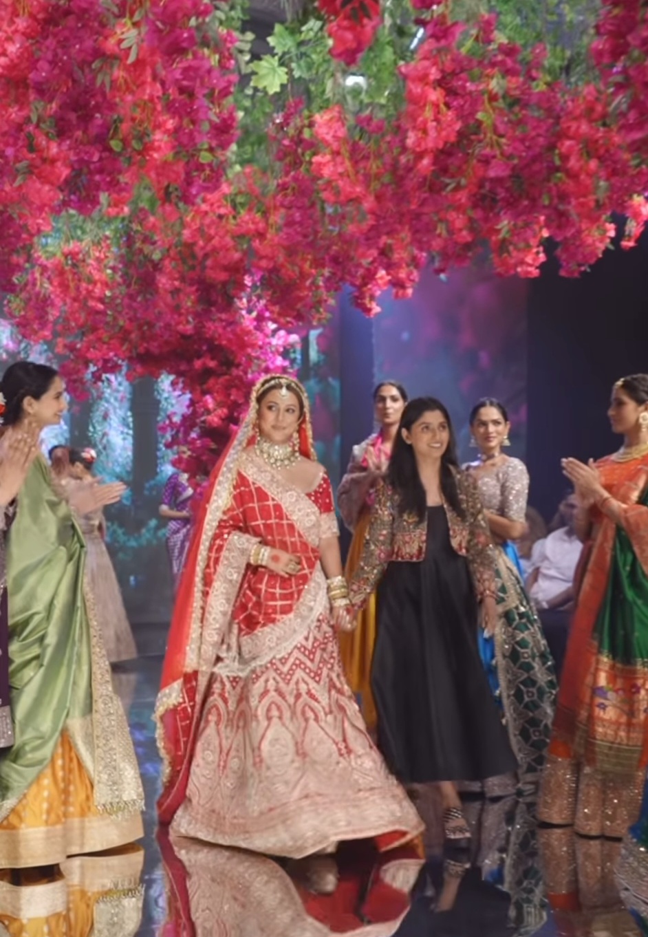 As the star of Vinal Patel’s “Sajani” bridal collection, Hina Khan grabbed spotlight. She looked amazing in a gorgeous red outfit that included a flared lehenga skirt with heavy sequin embroidery and a scoop-neck shirt with delicate silver hand embroidery, displaying superb craftsmanship. She added an additional touch of beauty to her bridal look by draping a beautiful veil over her head and draping a matching dupatta in the front.