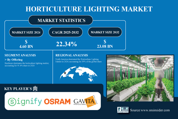 Horticulture Lighting Market Size to Exceed USD 23.08 Billion by 2032, Rising at 22.34% CAGR | Report by SNS Insider