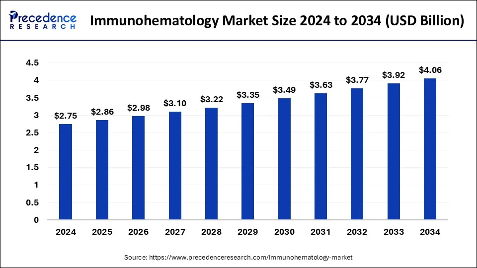 Ottawa, Nov. 07, 2025 (GLOBE NEWSWIRE) — The immunohematology market is estimated at USD 2.86 billion in 2025 and is predicted to increase from USD 2.98 billion in 2026 to USD 4.06 billion by 2034, registering a CAGR of 3.97%.