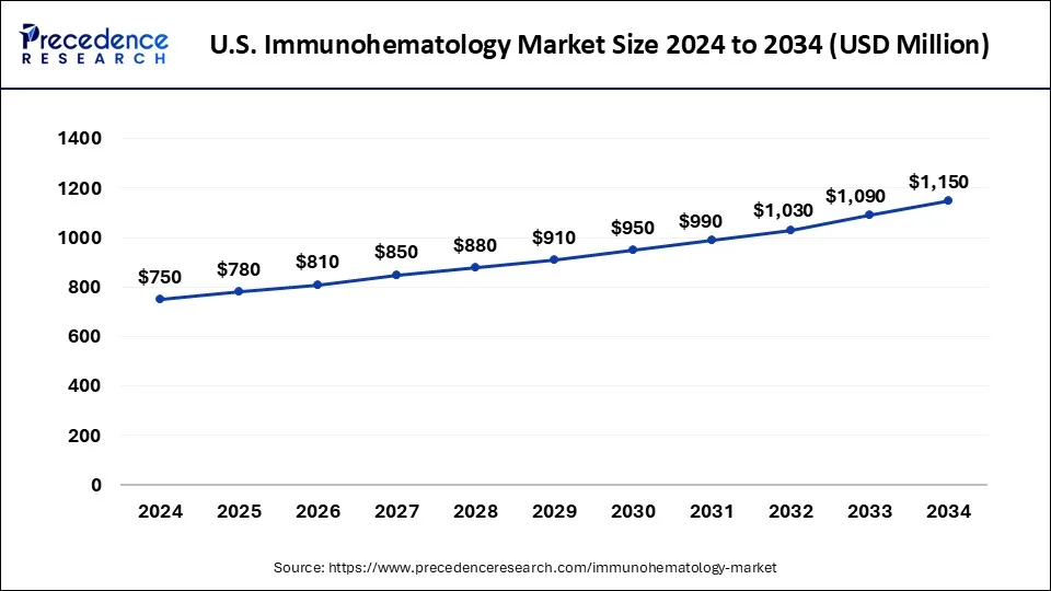 According to Precedence Research, the U.S. immunohematology market size is calculated at USD 780 million in 2025 and is expected to cross USD 1,150 million by 2034, with a CAGR of 4.37% from 2025 to 2034.