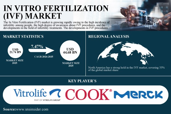 As per SNS Insider, The In Vitro Fertilization (IVF) Market size was valued at USD 21.74 Billion in 2025 and is projected to reach USD 44.68 Billion by 2035, growing at a CAGR of 7.47% during 2026–2035. The market for in vitro fertilization (IVF) is expanding quickly due to the increasing prevalence of infertility, the high level of knowledge on IVF techniques, and advancements in the field of infertility therapies.