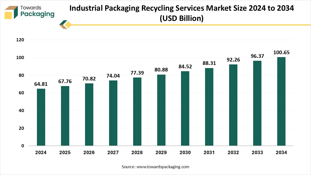 According to Towards Packaging consultants, the global industrial packaging recycling services market is projected to reach approximately USD 100.65 billion by 2034, increasing from USD 64.81 billion in 2024, at a CAGR of 4.53% during the forecast period 2025 to 2034.