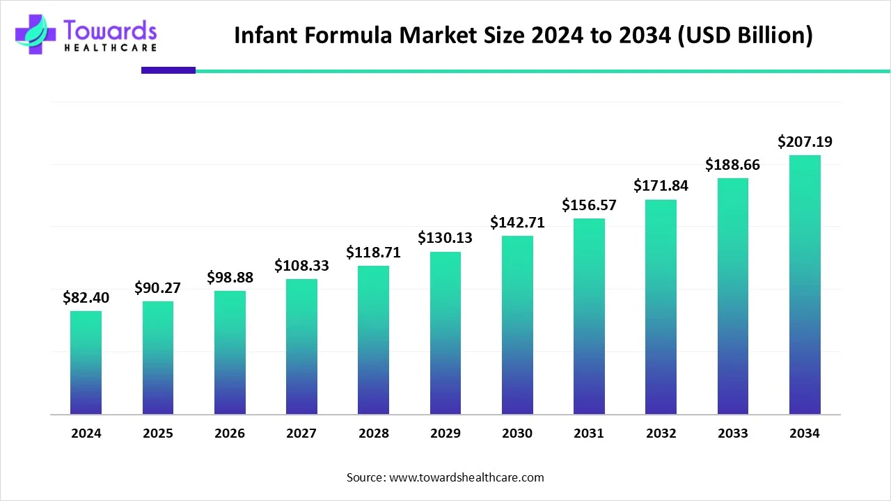 Ottawa, Nov. 07, 2025 (GLOBE NEWSWIRE) — The global infant formula market size was valued at USD 82.4 billion in 2024 and is predicted to hit around USD 207.19 billion by 2034, rising at a 9.55% CAGR, a study published by Towards Healthcare a sister firm of Precedence Research.