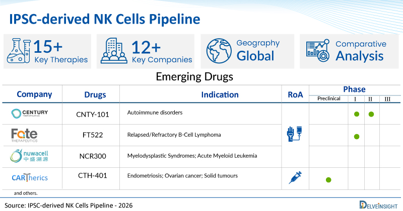- DelveInsight’s IPSC-derived NK cells pipeline report depicts a robust space with 12+ active players working to develop 15+ pipeline IPSC-derived NK cells drugs.