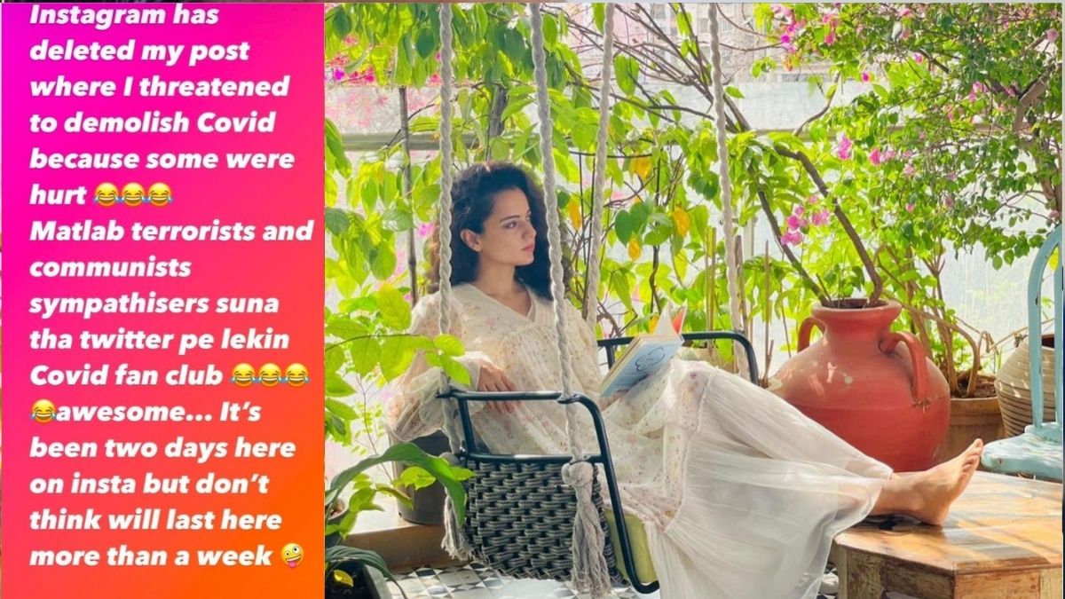 “Instagram has deleted my post where I threatened to demolish Covid because some were hurt. Matlab terrorists and communists sympathisers suna tha Twitter pe lekin Covid fan club awesome. It’s been two days here on Insta but don’t think will last here more than a week,” the actress wrote on her Instagram story on Sunday.