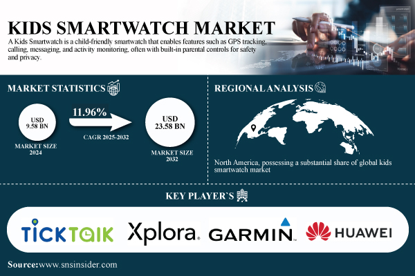 According to the SNS Insider,“The Kids Smartwatch Market Size was valued at USD 9.58 billion in 2024 and is expected to reach USD 23.58 billion by 2032 and grow at a CAGR of 11.96% over 2025-2032.”