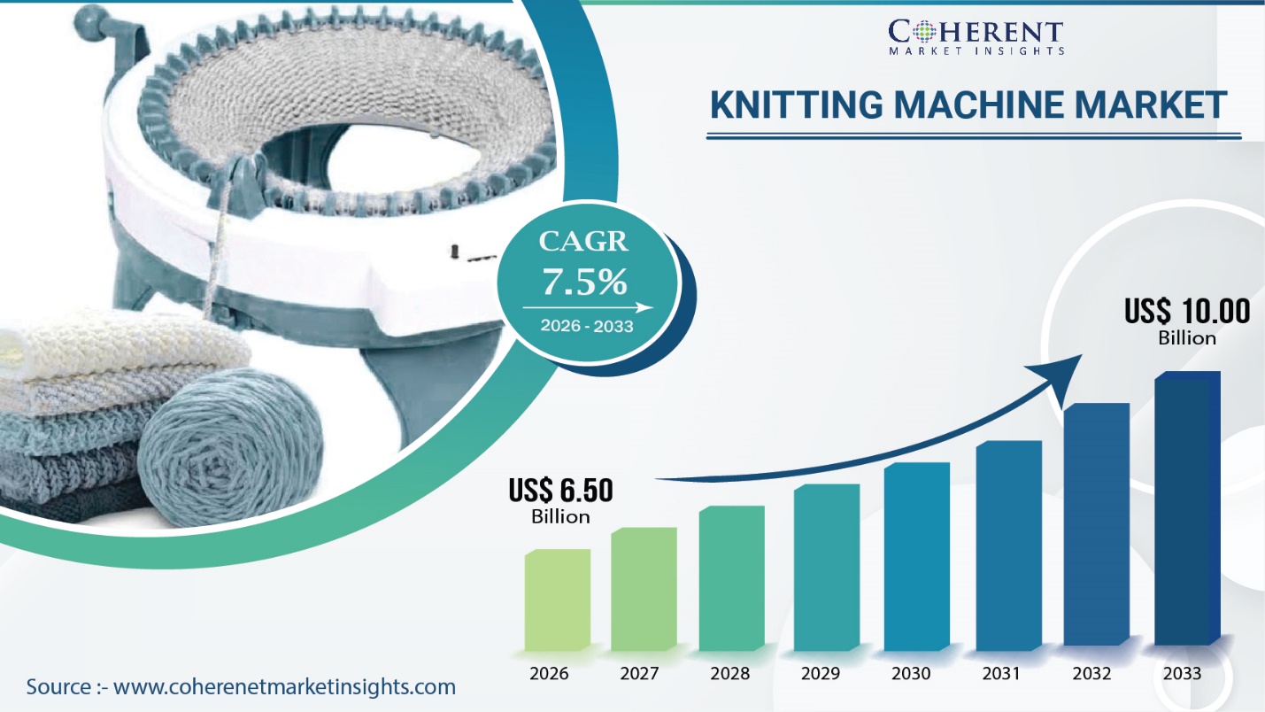 Burlingame, CA, Jan. 14, 2026 (GLOBE NEWSWIRE) — The Global Knitting Machine Market is expected to reach USD 6.50 Bn in 2026 and will expand to USD 10.00 Bn by 2033, registering a CAGR of 7.5% between 2026 and 2033. The global knitting machine market is expanding as growing consumer demand for flexible and breathable fabrics fuels increased adoption of knitted textiles. Known for their superior softness, elasticity, and comfort compared to woven fabrics, knitted materials are widely used in sportswear, casual apparel, and home furnishings. As athleisure and performance-driven fashion continue to gain popularity, greater emphasis is placed on fabric functionality, particularly freedom of movement and effective moisture management.