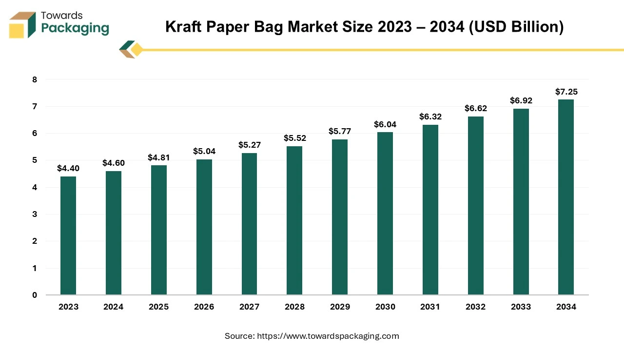 According to Towards Packaging consultants, the global kraft paper bag market is projected to reach approximately USD 7.25 billion by 2034, increasing from USD 4.81 billion in 2025, at a CAGR of 4.65% during the forecast period 2025 to 2034.
