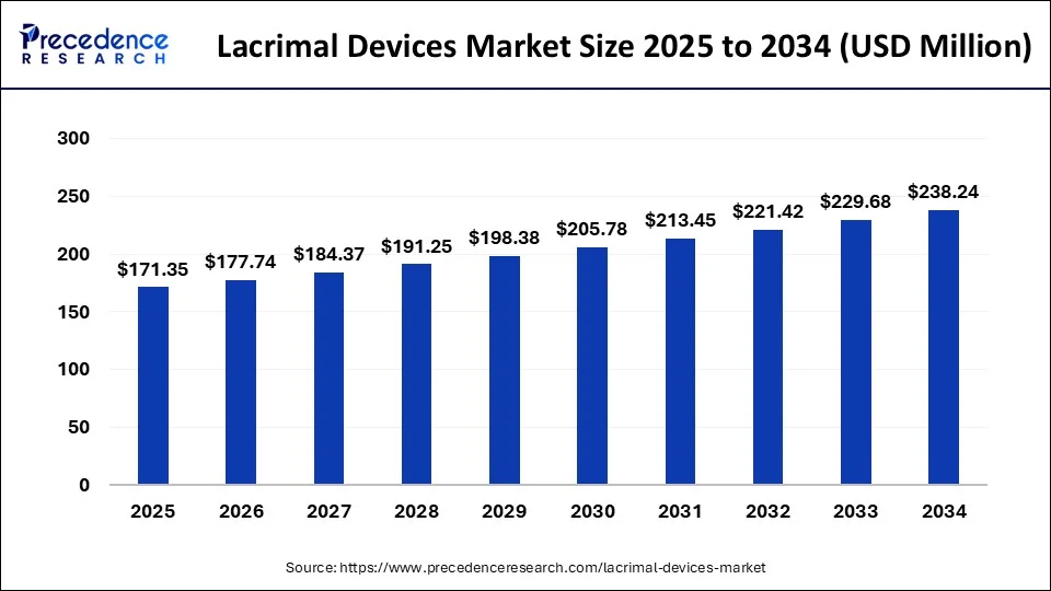 According to Precedence Research, the global lacrimal devices market size is valued at USD 171.35 million in 2025, and it is projected to rise from USD 177.74 million in 2026 to nearly USD 238.24 million by 2034, with an expected CAGR of 3.73% from 2025 to 2034.
