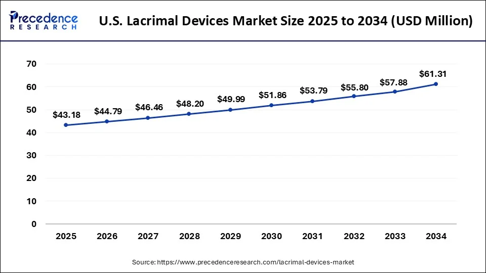 The U.S. lacrimal devices market size is valued at USD 43.18 million in 2025 and is anticipated to reach nearly USD 61.31 million by 2034, with a CAGR of 3.95% from 2025 to 2034.
