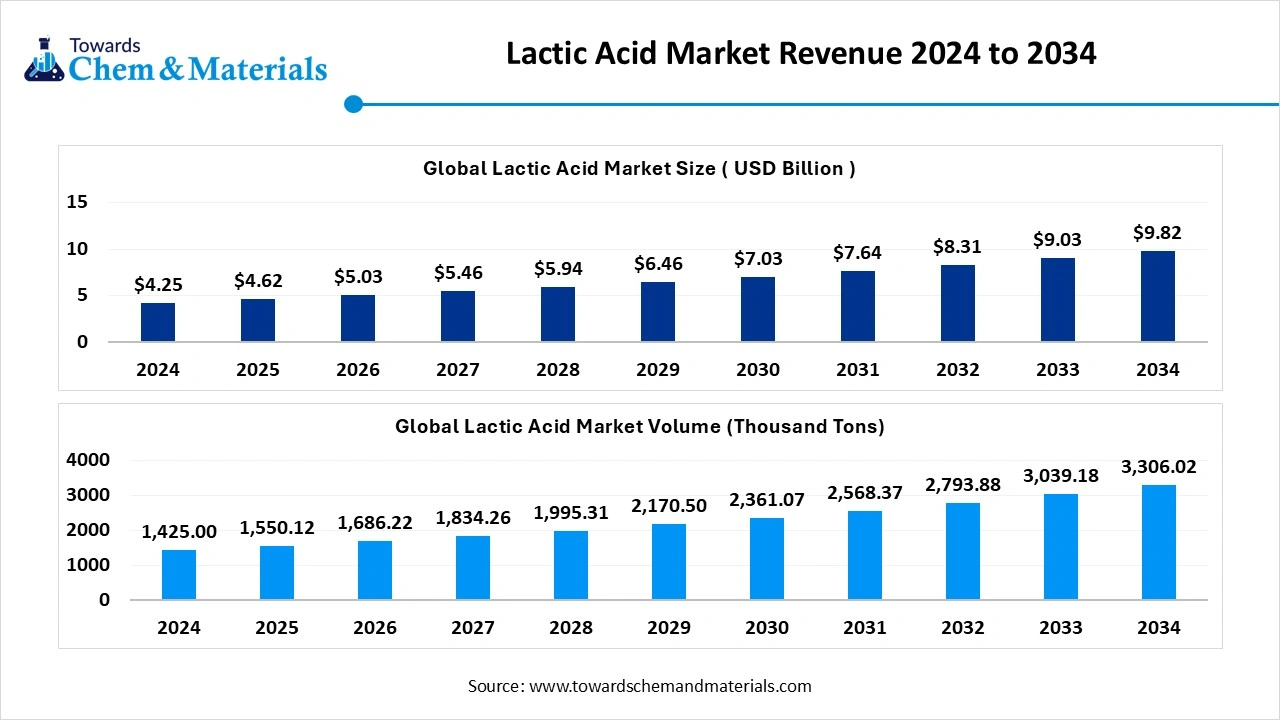 According to Towards Chemical and Materials, the global Lactic Acid market size is calculated at USD 4.62 billion in 2025 and is expected to be worth around USD 9.82 billion by 2034, growing at a compound annual growth rate (CAGR) of 8.74% over the forecast period 2025 to 2034. The Key companies profiled are BASF; Galactic; Musashino Chemical (China) Co., Ltd.; Futerro; Corbion; Dow; TEIJIN LIMITED; NatureWorks LLC; Henan Jindan Lactic Acid Technology Co. Ltd.; thyssenkrupp AG; Cellulac; Jungbunzlauer Suisse AG; Vaishnavi Bio Tech; Danimer Scientific