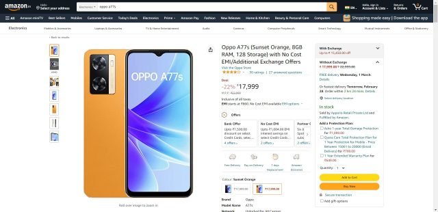 The OPPO A77s has a strong collection of specifications. Users may take excellent photos and videos on a single charge thanks to its superb camera profile and a strong battery. The OPPO A77s is now available on Amazon for Rs. 17,999. On this smartphone, which usually costs Rs 22,999, you may save up to 22%. In addition, the phone has a one-year manufacturer warranty and the in-box accessories have a six-month warranty.