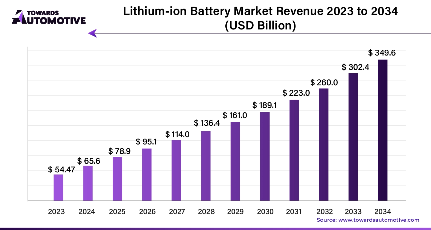 According to Towards Automotive researchers, the global lithium-ion battery market size is calculated at USD 78.9 billion in 2025 and is expected to reach around USD 349.6 billion by 2034, growing at a CAGR of 20.34% from 2024 to 2034.