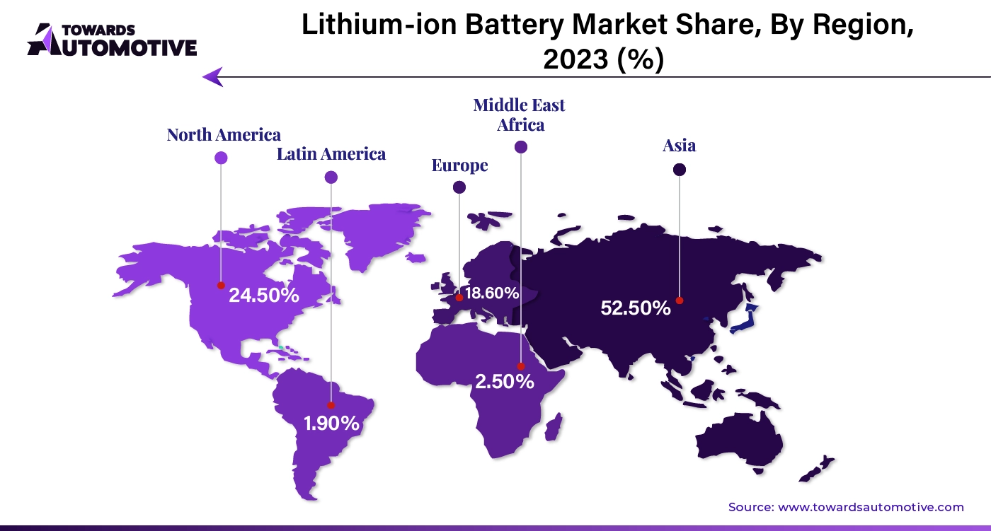 Asia Pacific registered dominance in the lithium-ion battery market with the largest share in 2024. This is mainly due to its robust manufacturing capabilities, a flourishing electric vehicle industry, and heightened investments in renewable energy infrastructure. Nations such as China, Japan, and South Korea have positioned themselves as global pioneers in battery production and innovation. Government initiatives that support clean mobility, significant funding for research and development, and increased demand for consumer electronics further bolstered the growth of the market in the region. Additionally, the presence of leading battery manufacturers and advancements in battery recycling and next-generation technologies present substantial growth possibilities for the market.
