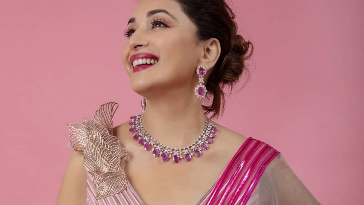 In the Instagram photo-op, Madhuri is seen posing in a light and dark pink zari lehenga. She completed her look with dark pink lips, drop diamond earrings and a neck piece. She tied her hair into an untidy bun.