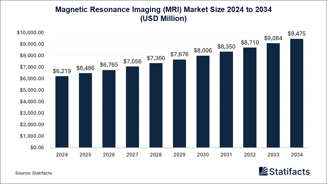 The global magnetic resonance imaging (MRI) market size will soar from USD 6,486 million in 2025 and is anticipated to reach around USD 2,619 million by 2034, expanding a CAGR of 9.2% from 2025 to 2034. A study published by Statifacts a sister firm of Precedence Research.