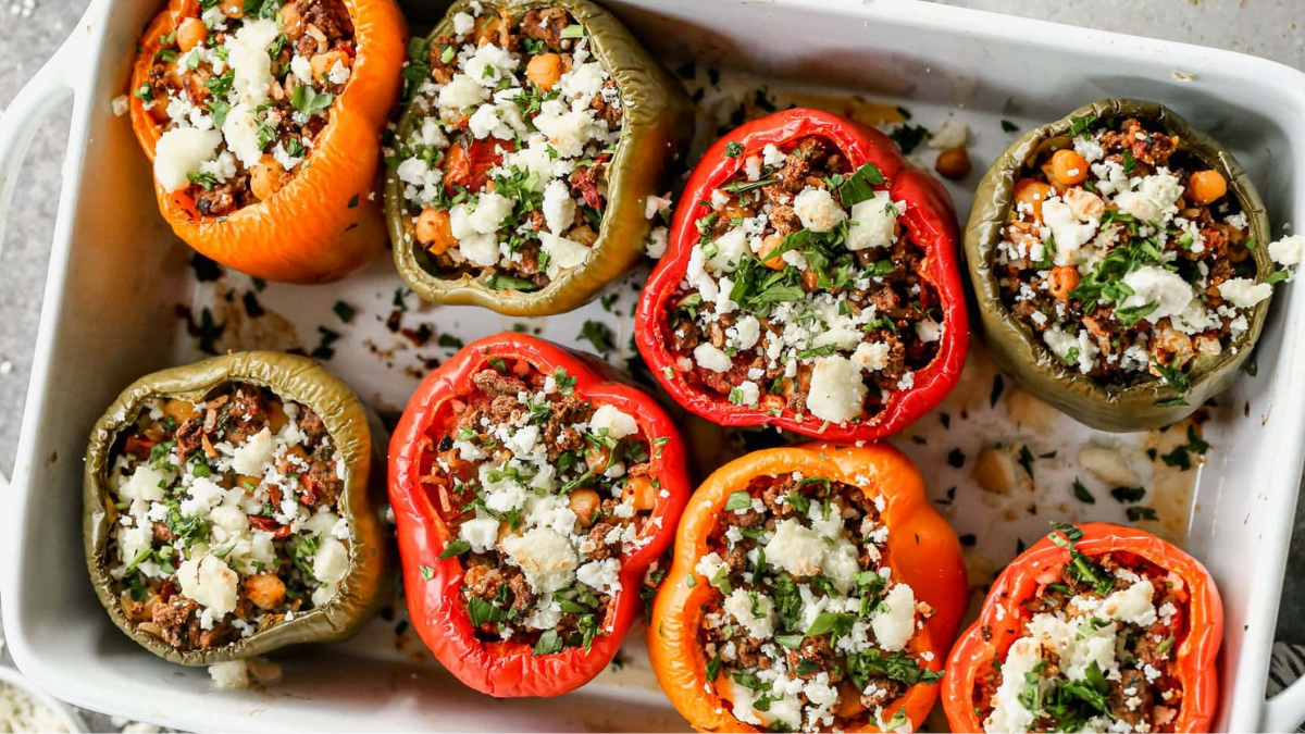 These stuffed bell peppers can be served immediately at room temperature or slightly chilled. If you’re preparing them in advance, cover the tray loosely with foil or cling wrap and refrigerate for up to two hours before serving. When ready, drizzle a touch of olive oil or a few drops of balsamic glaze over the top for extra shine and flavour.