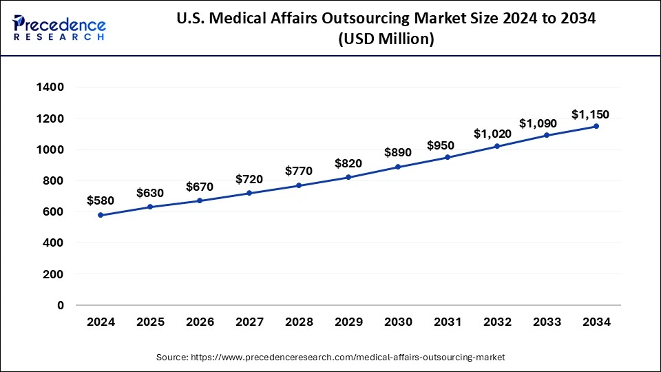 According to Precedence Research, the U.S. medical affairs outsourcing market size was valued at USD 580 million in 2024 and is estimated to grow from USD 630 million in 2025 to USD 1,150 million by 2034, accelerating a solid CAGR of 7.05% from 2025 to 2034.