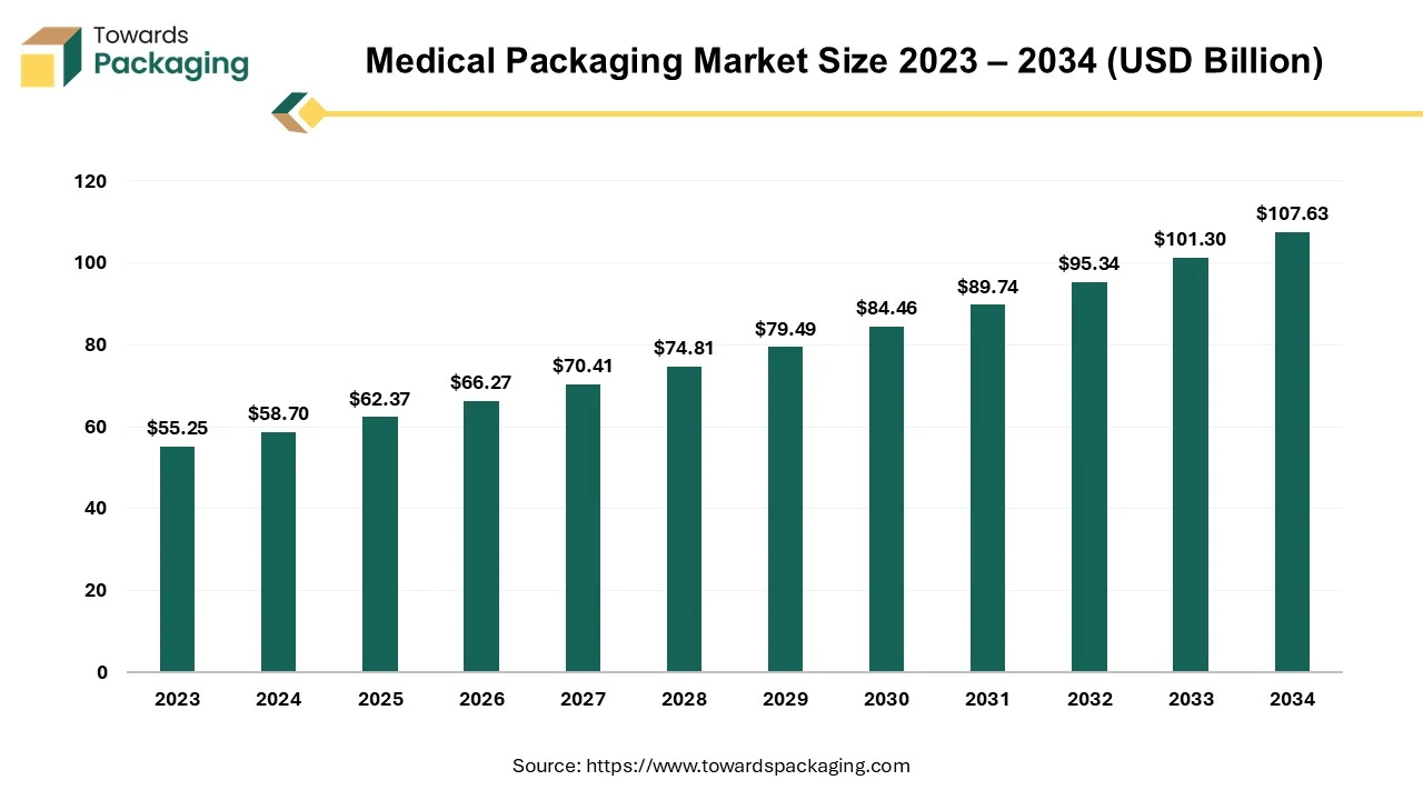 Ottawa, Feb. 18, 2025 (GLOBE NEWSWIRE) — The medical packaging market is forecast to grow at a CAGR of 6.25%, from USD 62.37 billion in 2025 to USD 107.63 billion by 2034, over the forecast period from 2025 to 2034. A study published by Towards Packaging a sister firm of Precedence Statistics.