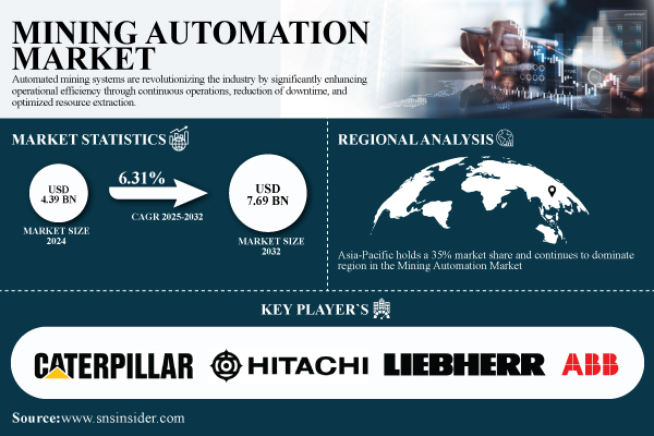 According to the SNS Insider,“The Mining Automation Market Size was worth USD 4.39 Billion in 2024 and is expected to reach USD 7.69 Billion by 2032 and grow at a CAGR of 6.31% during 2025-2032.”