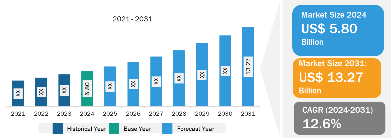 Modular UPS System Market Growth: The modular UPS system market was valued at US$ 5.80 billion in 2024 and is projected to reach US$ 13.27 billion by 2031; it is expected to register a CAGR of 12.6% during 2024–2031.